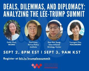 Join us today at 5pm PT/8pm ET (Sept. 3 at 9am KST) for a webinar debriefing South Korean President Lee Jae-myung’s first meeting with U.S. President Trump. We’ll hear from speakers Youngmi Cho (PEACEMOMO), Paul Liem (Korea Policy Institute), and Dae-Han Song (International Strategy Center), moderated by Cathi Choi (Women Cross DMZ). View the recording here.