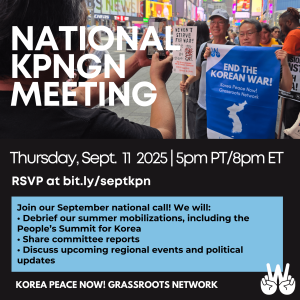 Our September KPNGN meeting will take place next Thursday, September 11 at 5pm PT/8pm ET! We will debrief our summer mobilizations, including the People’s Summit for Korea, share committee reports, and discuss upcoming regional events and political updates. Immediately after, on the same zoom link, we will also resume our three-part Korea Peace Now! Grassroots Network Orientation this month! In Part 1, we’ll be covering the history of the Korean War 101. RSVP here.