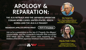 April 3 at 1pm HST/4pm PT/7pm ET |Â APOLOGY & REPARATION: The Jeju 4.3 Retrials and the Japanese American coram nobis Cases: The United States, South Korea, and the Jeju 4.3 Tragedy