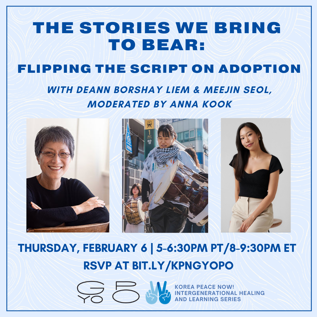 What exists beyond, around, and throughout the lives of adopted people and their various families and communities? How can we uplift a multitude of narratives in addition to the oft-told “reunion” stories? Individuals adopted from Korea and their first families bring especially critical stories to bear on the topic of ending the Korean War and “tongil” (통일, “reunification of the Korean peninsula”). Join us to hear from award-winning filmmaker Deann Borshay Liem and aspiring director and community organizer Meejin Seol, in a conversation moderated by journalist Anna Kook. Speakers will talk about their work, families, the geopolitics of adoption, and why we cannot hope to understand the history of the Korean War, militarism, or division without understanding the history of transnational adoption. We will also discuss legacies of the ongoing Korean War and the present-day political landscape in South Korea, including impeachment and ongoing resistance by Korean civil society. ASL interpretation will be provided.