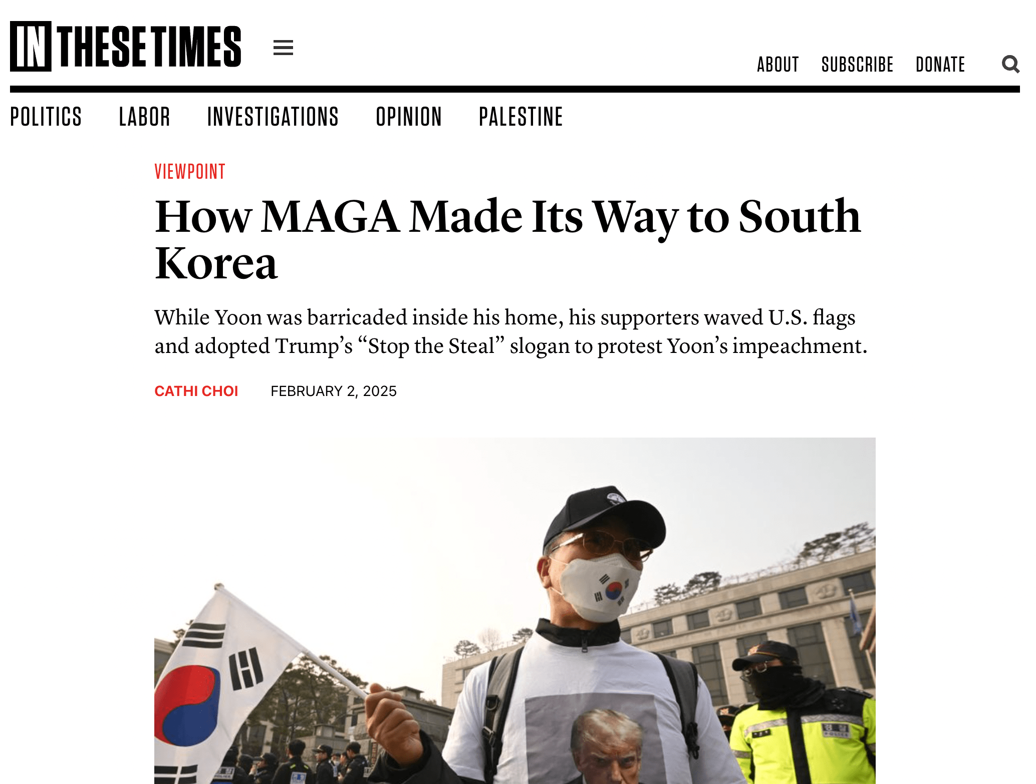 NEW! How MAGA Made Its Way to South Korea | Cathi Choi writes for In These Times about the influence of Trump’s MAGA in South Korea. “It would be easy to identify these apparent similarities and not interrogate further. But the connections between U.S. and South Korean far-right forces are both old and new, rooted in decades of U.S. and South Korean militarism, the ongoing Korean War, and the oligarchs who profit,” Cathi writes. “The ongoing events in South Korea should not just be a distant news item for U.S. readers with abstract lessons for “democracy.” We must understand that the United States has been involved with the Korean Peninsula for decades, and U.S. militarism has profoundly shaped South Korea’s political landscape.”