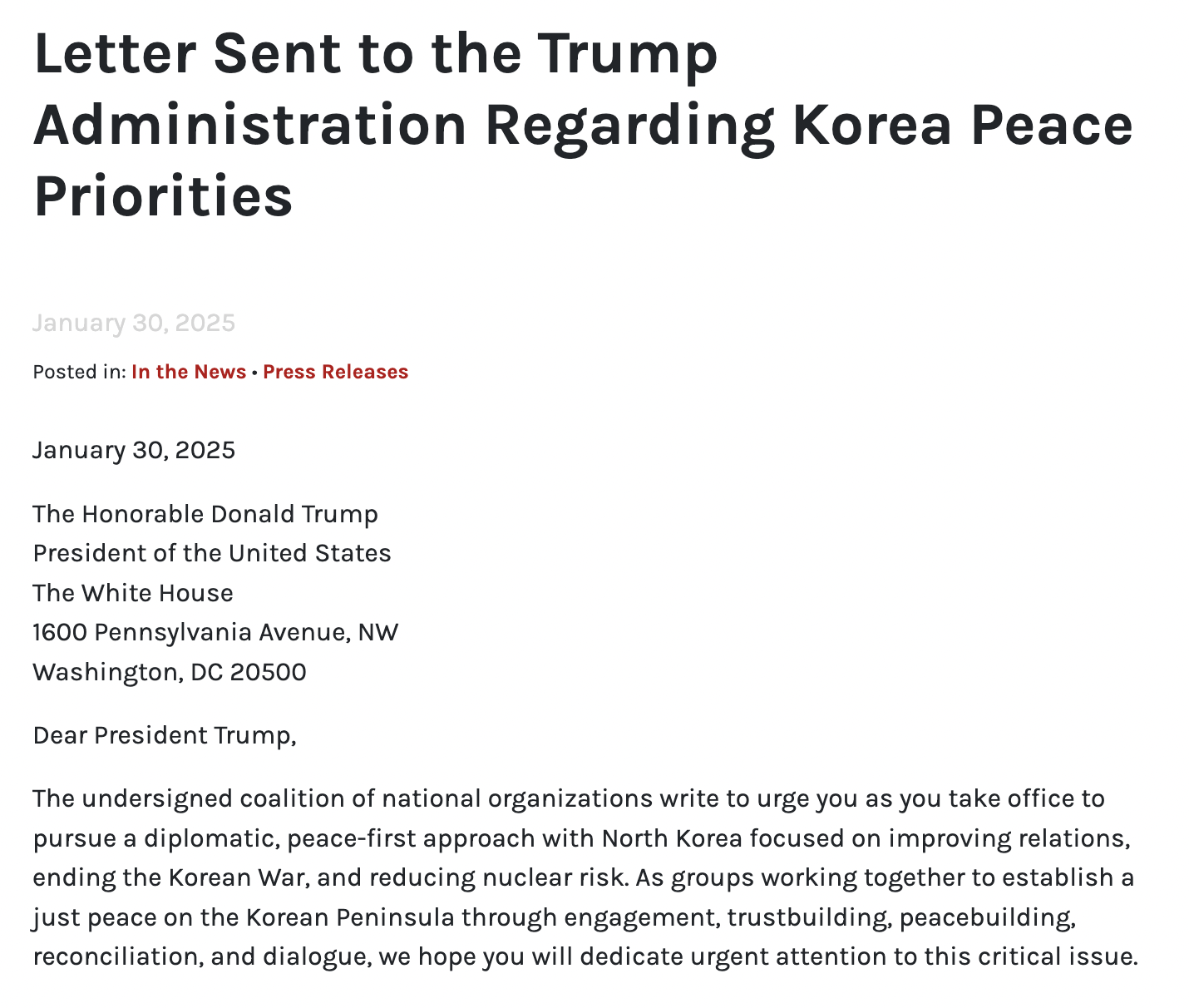 Korea Peace Priorities Coalition Letter to the Trump Administration |The Korea Peace Now! Grassroots Network joined over 40 national organizations in signing a letter urging the Trump administration to pursue a diplomatic, peace-first approach with North Korea focused on improving relations, ending the Korean War, and reducing nuclear risk. Several Korean news outlets covered the letter, including OhmyNews and Daum.
