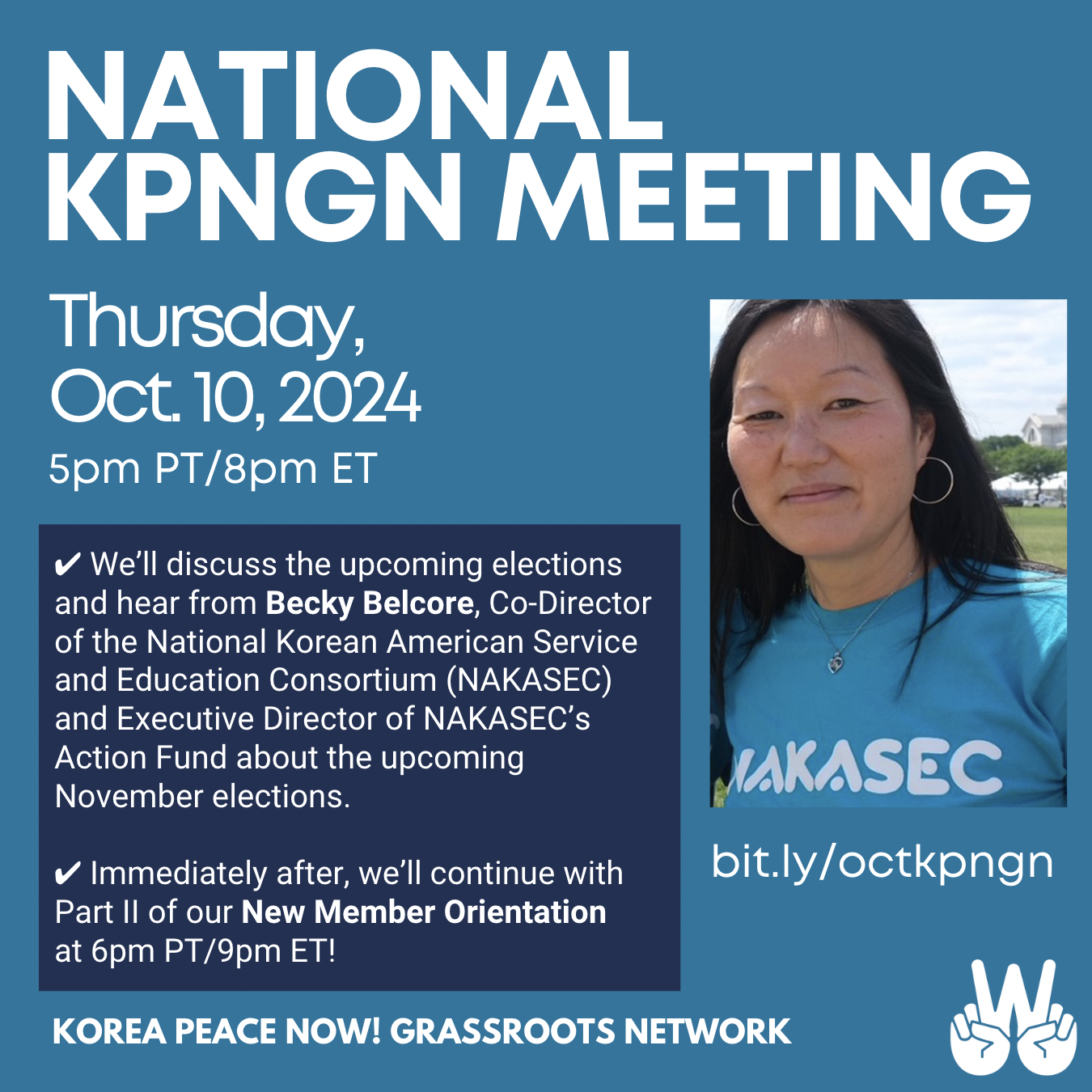 Our October KPNGN Meeting will be taking place on Thursday, October 10 at 5pm PT/ 8pm ET! We will be joined by Becky Belcore, Co-Director of National Korean American Service and Education Consortium (NAKASEC) and Executive Director of NAKASEC Action Fund, who will speak about the work of NAKASEC’s Action Fund Pennsylvania’s program for the upcoming November elections. Register here.