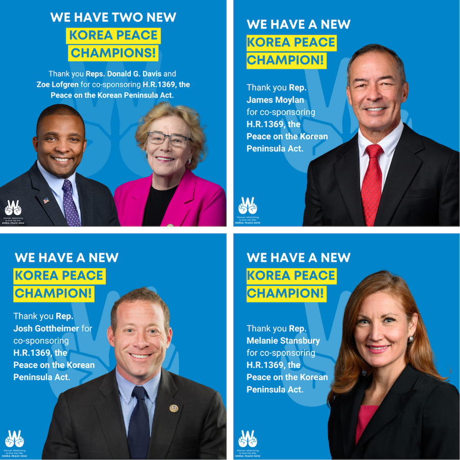 New Korea Peace Champions: In better news, in the last two months we have had several new Korea Peace Champions! Thanks to the constituents of Reps. Donald Davis (D-NC-1), Zoe Lofgren (D-CA-18), Josh Gottheimer (D-NJ-5), James C. Moylan (R-GU-At Large), and Melanie A. Stansbury (D-NM-1) who helped make this happen! H.R.1369 now has 48 co-sponsors. Please help us get to 50!