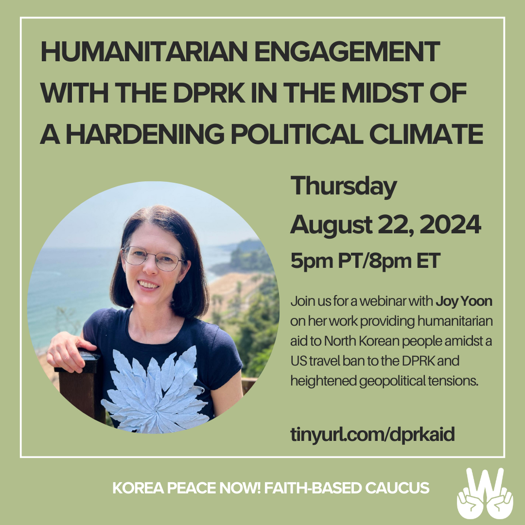 Join us for a webinar with Joy Yoon on her work providing humanitarian aid to North Korean people on Thursday, August 22 at 5pm PT/8pm ET. Register here!