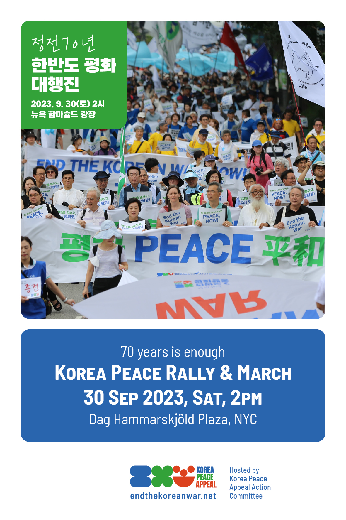 This Saturday, Sept. 30, 2-4pm, join members of the Korea Peace Appeal campaign for a march and rally in New York City at Dag Hammarskjöld Plaza and Ralph Bunche Park. For the past three years, the Korea Peace Appeal has been collecting hundreds of thousands of signatures calling for an official end to the Korean War. They plan to deliver the signatures to the United Nations Secretary-General and the UN Missions of the two Koreas, the US, and China. The rally will include speeches, performances, Korean traditional folk music (pungmul), and marches.