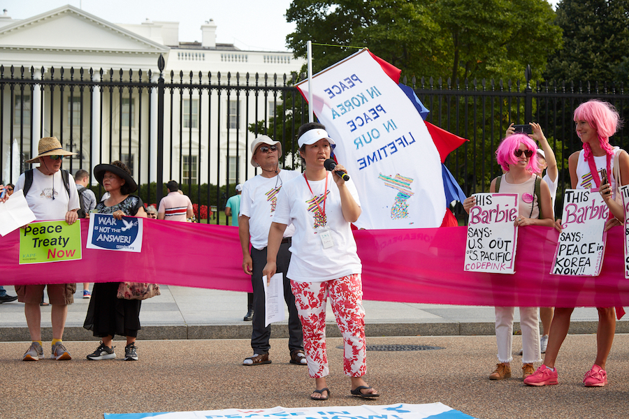 Echo of Women Cross DMZ leads the rally in front of the White House on July 27, 2023.