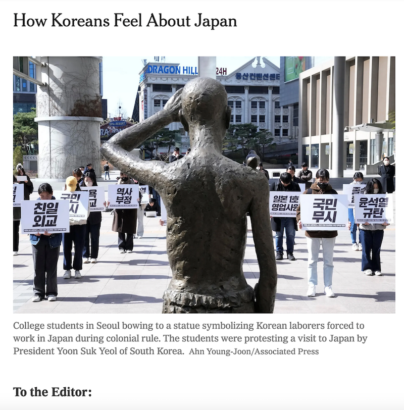 How Koreans Feel About Japan [Christine Ahn’s letter to the editor published in The New York Times, April 19, 2023]