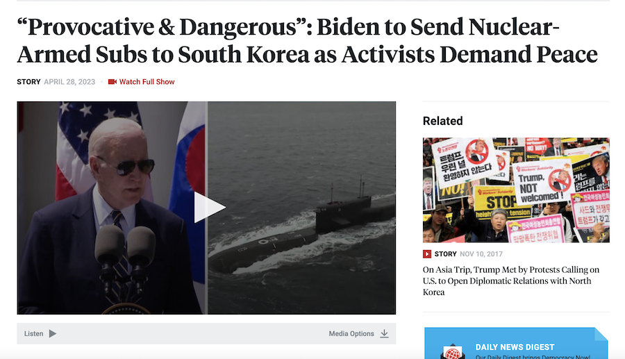 “Provocative & Dangerous”: Biden to Send Nuclear-Armed Subs to South Korea as Activists Demand Peace [Christine Ahn interviewed on Democracy Now, 4/28/23]