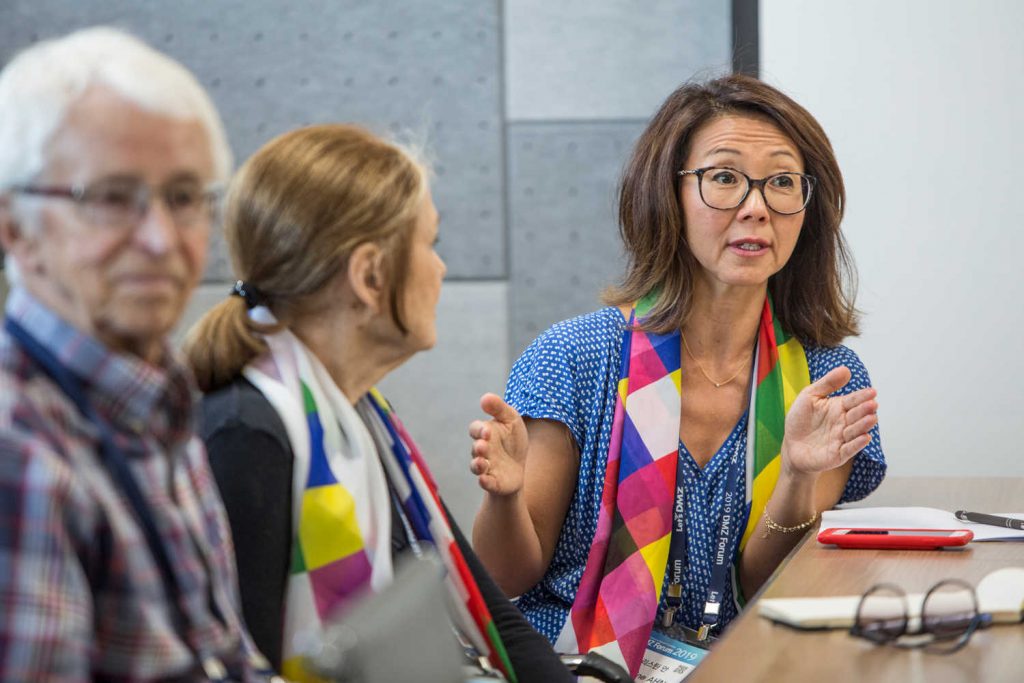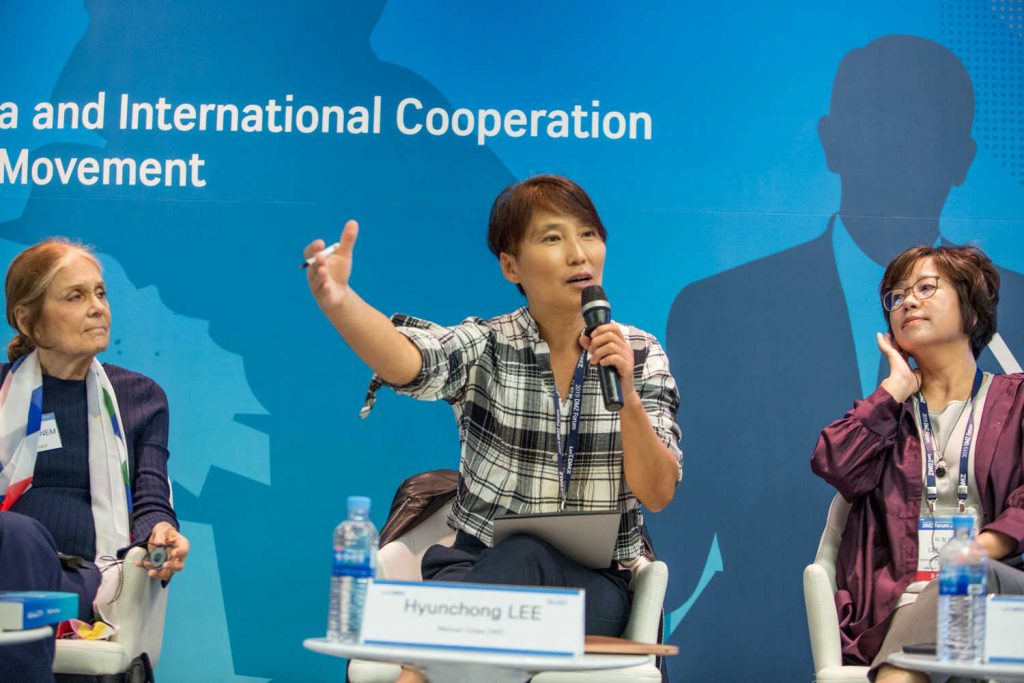 “I am one of the many Japanese people who hope for amicable relations between Japan and the Koreas,” said Kozue Akibayashi, the former international president of WILPF and a professor at Doshisha University in Kyoto, Japan. “The ongoing Korean War is used by the Japanese government to justify militarization of Okinawa, in Japan, and other places. I am here to say, no more.”