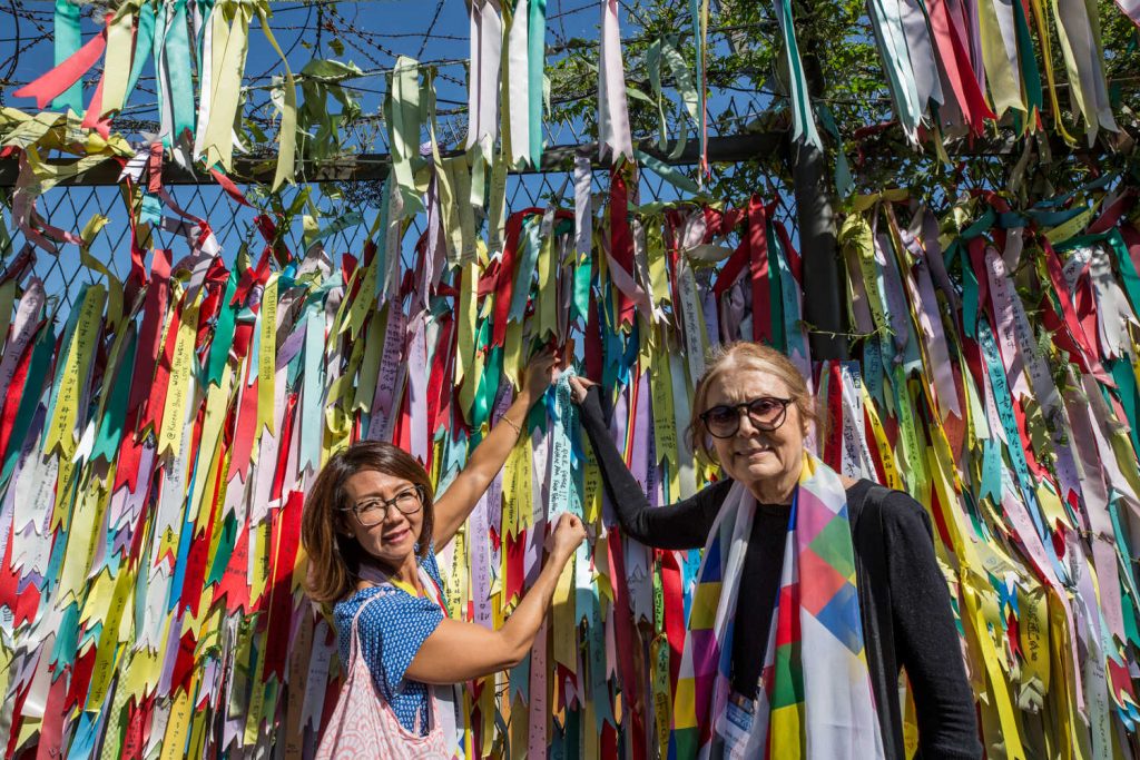 Our first stop was Imjingak Resort, located just 7 km from the Military Demarcation Line — the actual line dividing the two countries, which is surrounded by the DMZ — where we met with officials from the local government. A barbed-wire fence has become a living memorial to loved ones in North Korea. Christine Ahn, executive director of Women Cross DMZ and international coordinator of Korea Peace Now!, and Gloria Steinem wrote their own message of peace and tied it among the thousands of ribbons adorning the fence. Waving in the wind, the ribbons are a heartbreaking and sobering reminder of the painful division caused by the ongoing war.