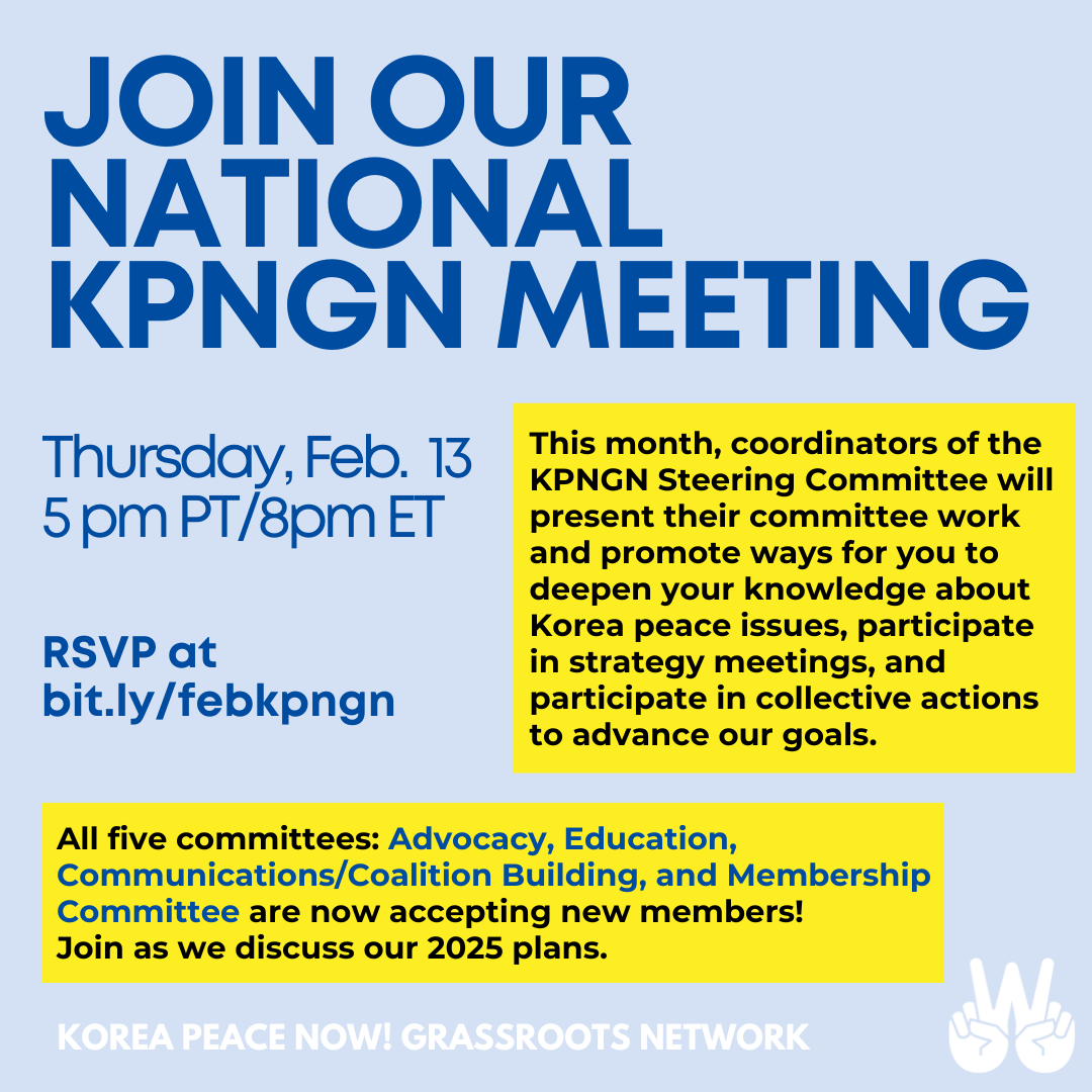 Happy Lunar New Year! Our next KPNGN meeting will happen Thursday, February 13, at 5pm PT/8pm ET. Coordinators of the KPNGN Steering Committee will present their work and discuss ways for you to deepen your knowledge about Korea peace issues and participate in strategy meetings and collective actions to advance our goals. We will also discuss our plans for 2025. RSVP at bit.ly/febkpngn